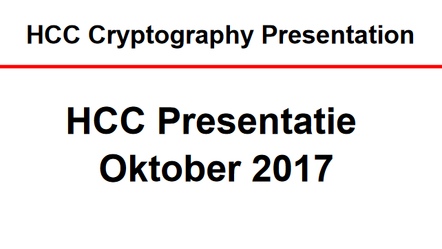 Op zaterdag 21 oktober 2017 om 14:00 uur heeft Andries Mulder van Mulder Training & Consultancy een lezing over Cryptografie gegeven. De presentatie werd georganiseerd door HCC!programmeren en HCC!opensource